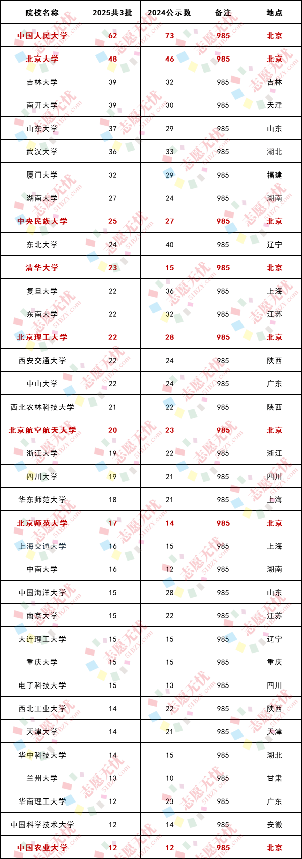 中国银行2025年录取985大学同学830人,与去年的录取人数相比有所下降。中国人民大学录用人数最多,高达62人,北京大学48人,武汉大学36人,厦门大学32人,清华大学23人,其它985高校录用人数如下:
